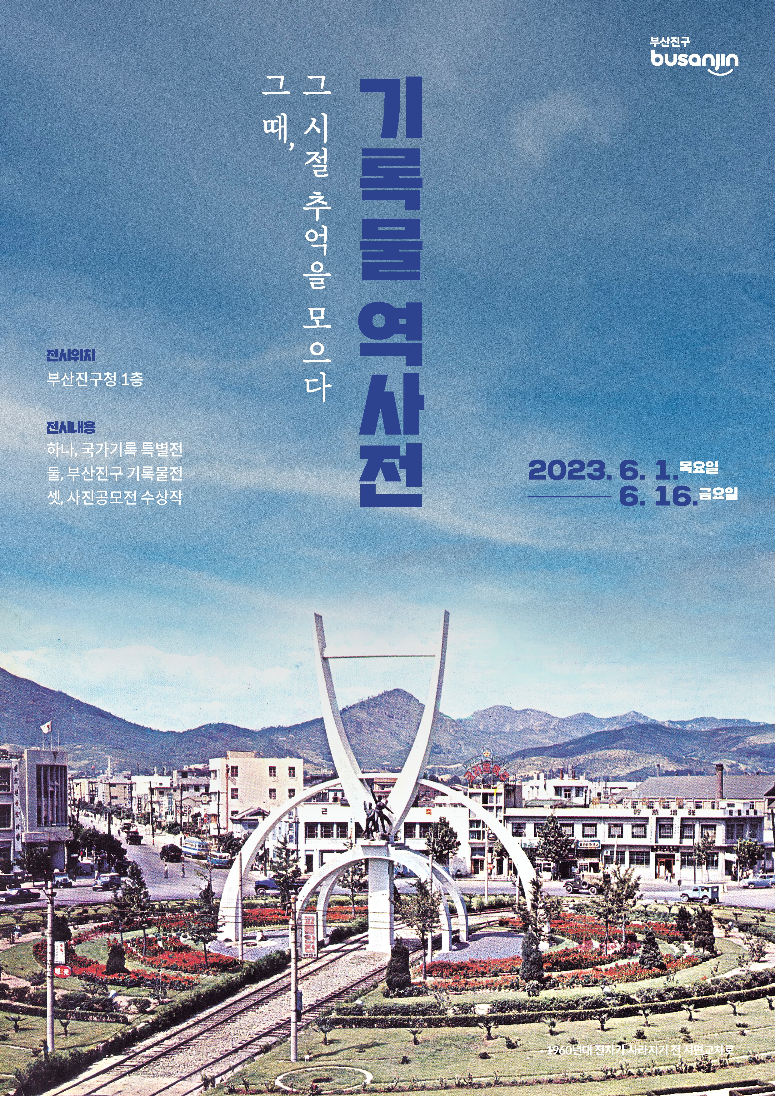 이번 기록물 역사전은 총 81점의 옛 사진과 14편의 옛 영상 등의 기록물 전시로 바쁜 일상에 지친 구민들의 마음을 위로하고 기록문화 확산에 기여하고자 기획되었으며 ▲국가기록특별전, ▲부산진구 기록물전, ▲추억의 사진 공모전 수상작 전시의 세 가지 주제로 구성된다.