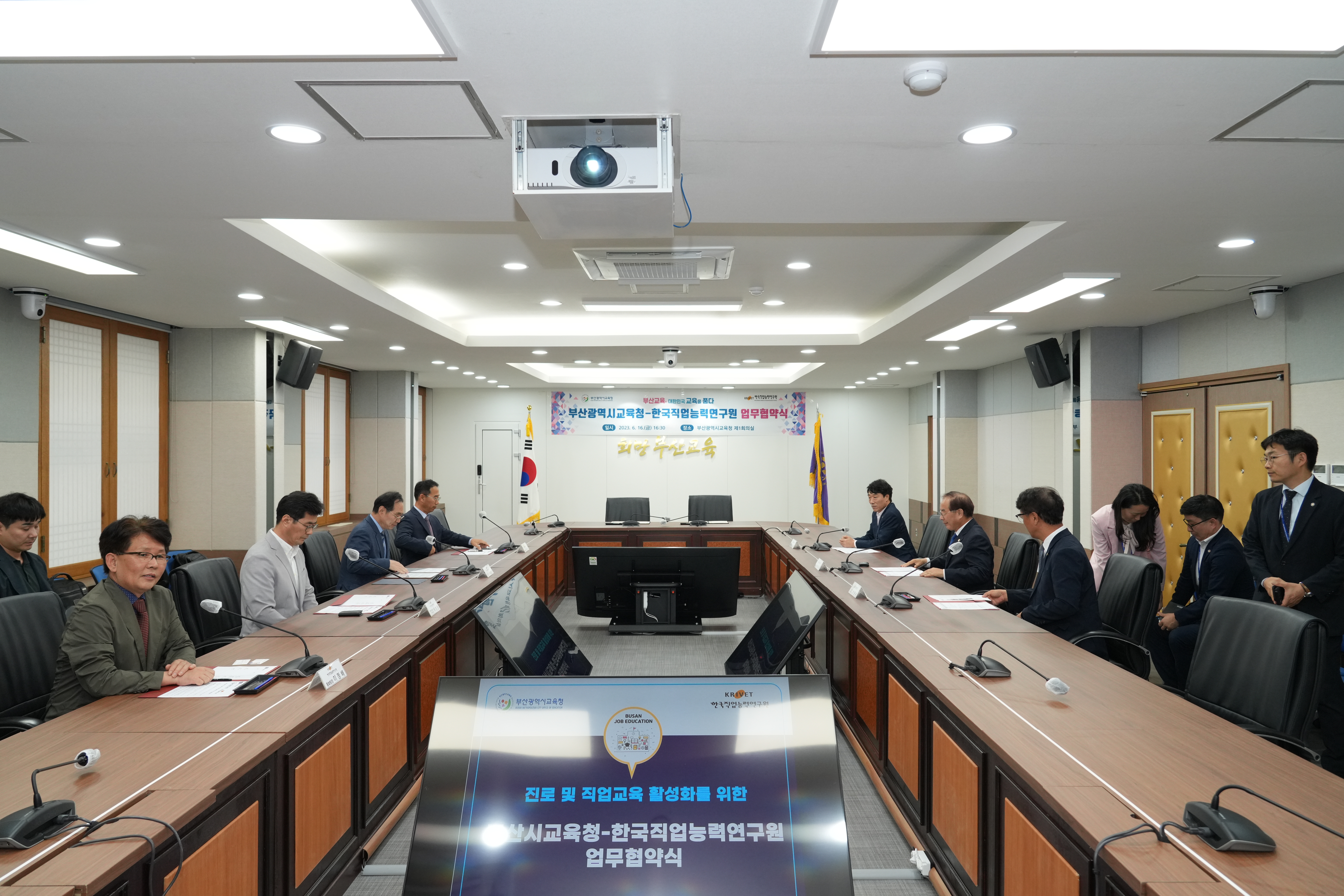 하윤수 부산광역시교육감이 16일 오후 4시 30분 시교육청 제1회의실에서 류장수 한국직업능력연구원 원장, 김덕기 전략기획본부장 등 관계자들이 참석한 가운데 진로·직업 교육 발전을 위한 업무 협약을 체결했다.