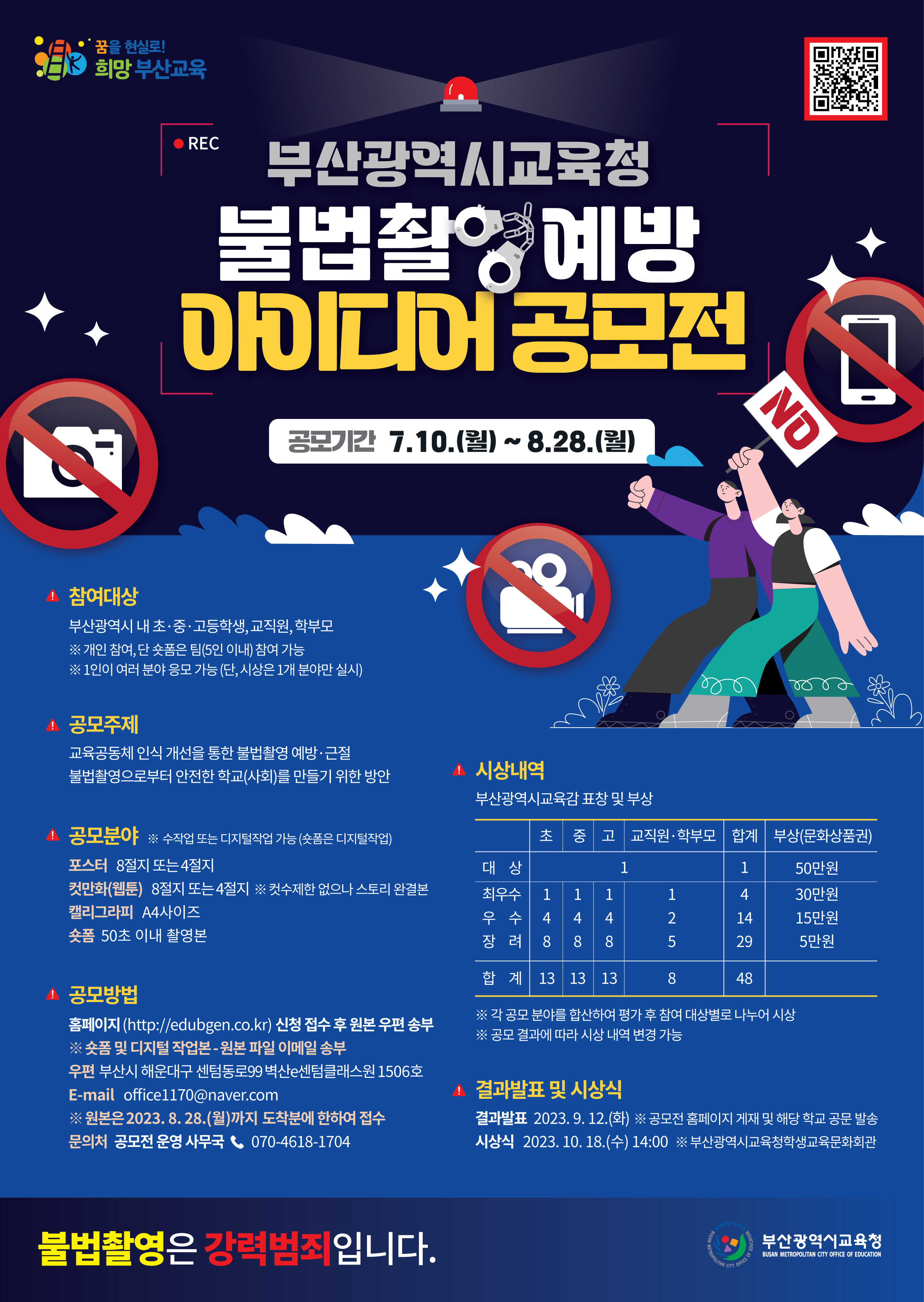 부산광역시교육청(교육감 하윤수)은 7월 10일부터 8월 28일까지 부산지역 초·중·고 학생, 교직원, 학부모를 대상으로 ‘불법 촬영 예방 아이디어 공모전’을 운영한다.